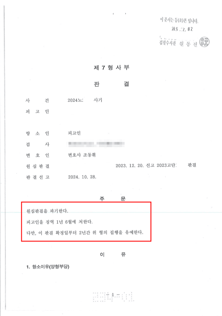 항소심 재판부는 저의 변론을 받아들여서 1심의 실형 판결을 취소하고 집행유예를 선고했습니다. 같은 종류의 전과가 있고 상당한 피해액이 발생한 사건임에도 불구하고 실형을 면하고 집행유예를 받아낸 것은 매우 의미 있는 성과였습니다. 불가능해 보였던 상황에서 이끌어낸 소중한 승리로, 의뢰인은 사회로 돌아갈 기회를 다시 한 번 얻을 수 있게 되었습니다.