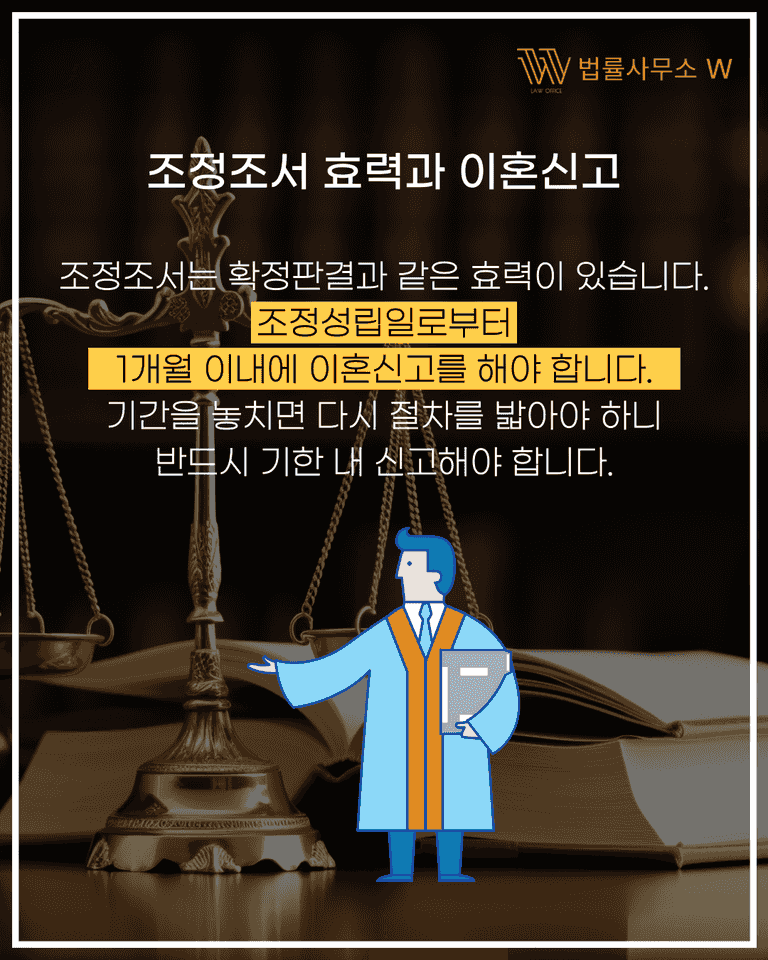 조정성립일로부터 1개월 이내에 이혼신고를 해야 혼인관계가 법적으로 완전히 해소됩니다.