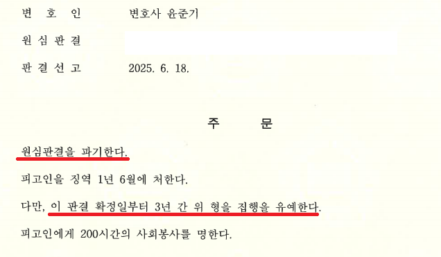 결과적으로 의뢰인은 1심에서 받은 실형 판결을 뒤집고 집행유예 판결을 받아 구치소에서 석방될 수 있었습니다.