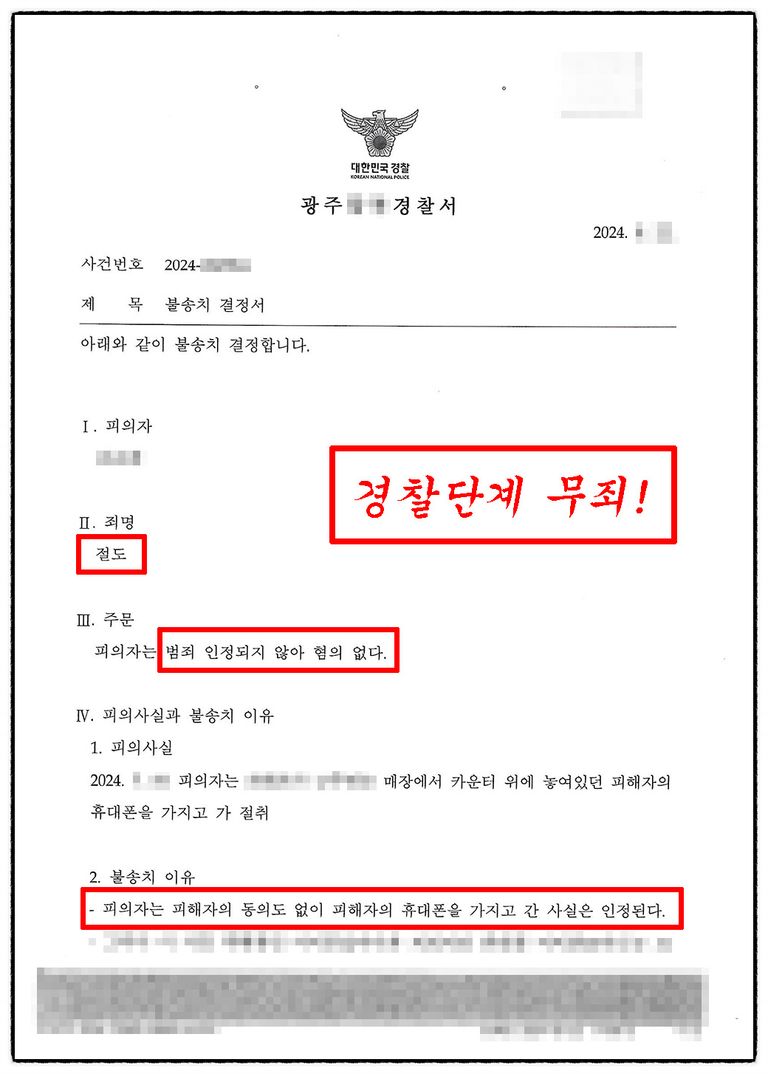 절도죄로 경찰조사를 받는 사건을 변호하여 경찰단계에서 불송치(혐의없음) 처분을 받아낸 성공사례 입니다.