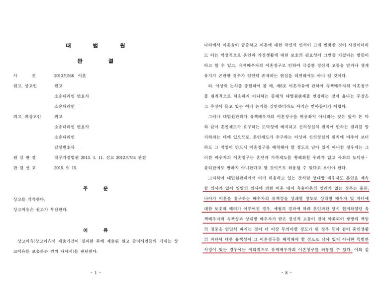 위 사례도 원고가 직장 동료와 부정한 행위를 지속한 후에 배우자인 피고를 상대로 이혼 소송을 제기하였고, 피고는 이혼의사가 없음을 일관되게 주장한 사안에서 유책배우자인 원고의 이혼 청구를 기각한 것입니다.