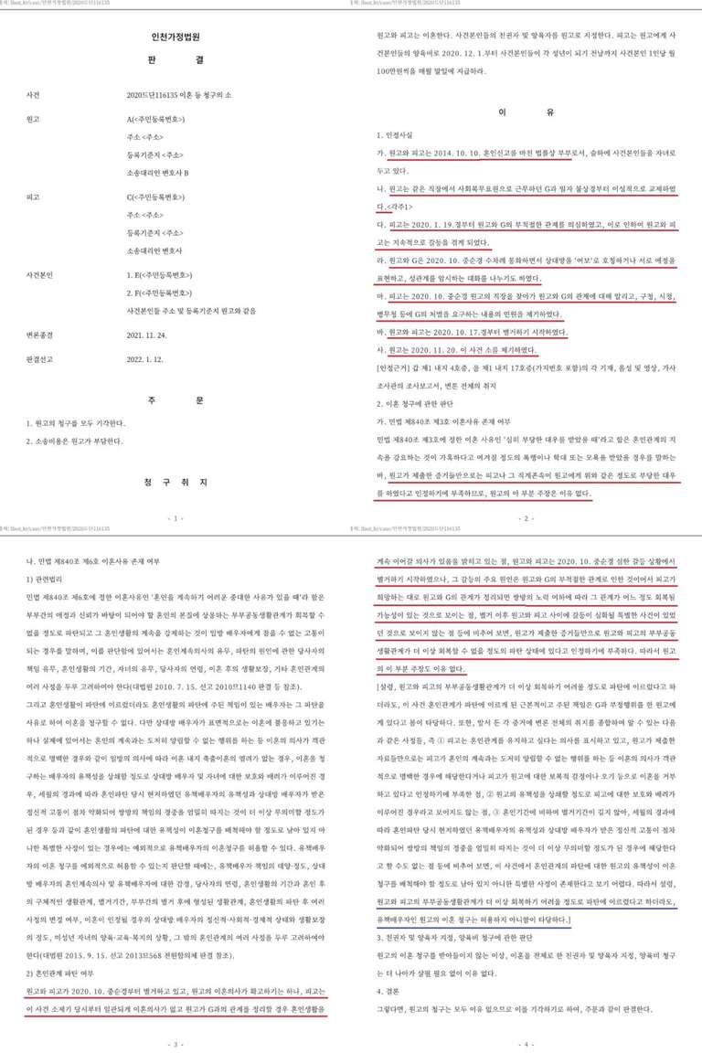 [원고는 같은 직장에서 사회복무요원으로 근무하던 G와 이성적으로 교제하는 등으로 지속적으로 부정한 행위를 하였고 이후 원고가 이혼 소송을 제기한 사안에서 원고의 청구를 기각한 사례 : 인천가정법원 2022. 1. 12, 선고 2020드단116135 판결]