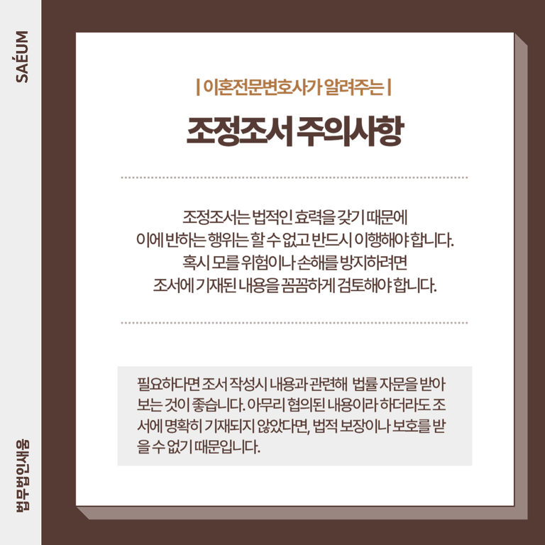 이혼 조정 과정에서 작성되는 조정조서는 법적인 효력을 갖습니다. 따라서 조서에 반하는 행위를 할 수 없으며, 조서에 기재된 내용은 반드시 이행되어야 합니다. 이때 혹시 모를 위험이나 손해를 방지하기 위해서는, 조서에 기재된 내용을 꼼꼼히 검토하고 법률 자문을 받아보는 것이 좋습니다. 아무리 협의된 내용이 있다 하더라도 조서에 명확히 기재되지 않으면 법적 보장을 받을 수 없기 때문입니다.