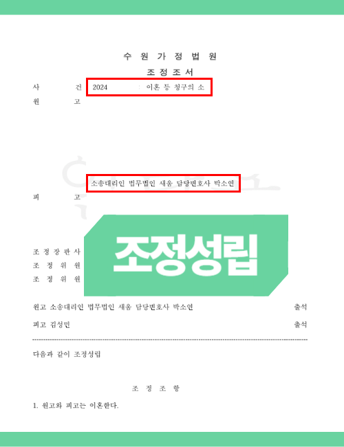 따라서 이러한 장점을 상대방에게도 설명하고, 적절한 조건을 유도해 합의를 이끌어내 보시기 바랍니다. 만약 혼자서 대처하기 어렵다면, 변호사를 선임해 이혼 조정 절차 전반에 대한 조력을 받는 것이 바람직합니다.