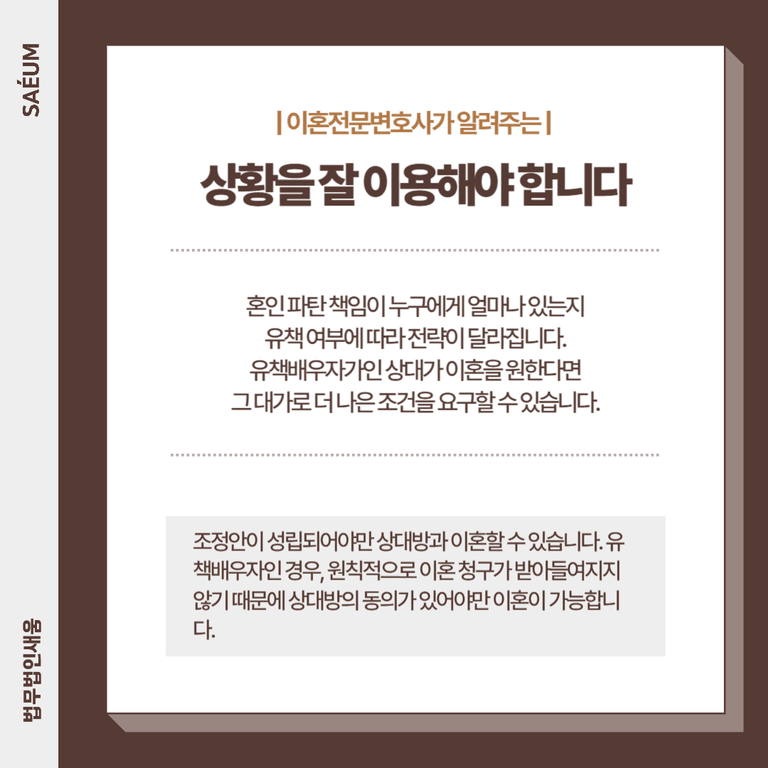 조정안이 성립되어야만 상대방과 이혼할 수 있습니다. 이때 혼인 파탄의 책임이 누구에게 얼마나 있는지, 누가 유책배우자인지에 따라 협상의 구조가 달라집니다. 유책배우자인 경우, 원칙적으로 이혼 청구가 받아들여지지 않기 때문에 상대방의 동의가 있어야만 이혼이 가능합니다. 따라서 유책배우자인 상대방이 이혼을 원하고 있다면, 그 대가로 더 나은 조건을 요구해 받아낼 수 있습니다.