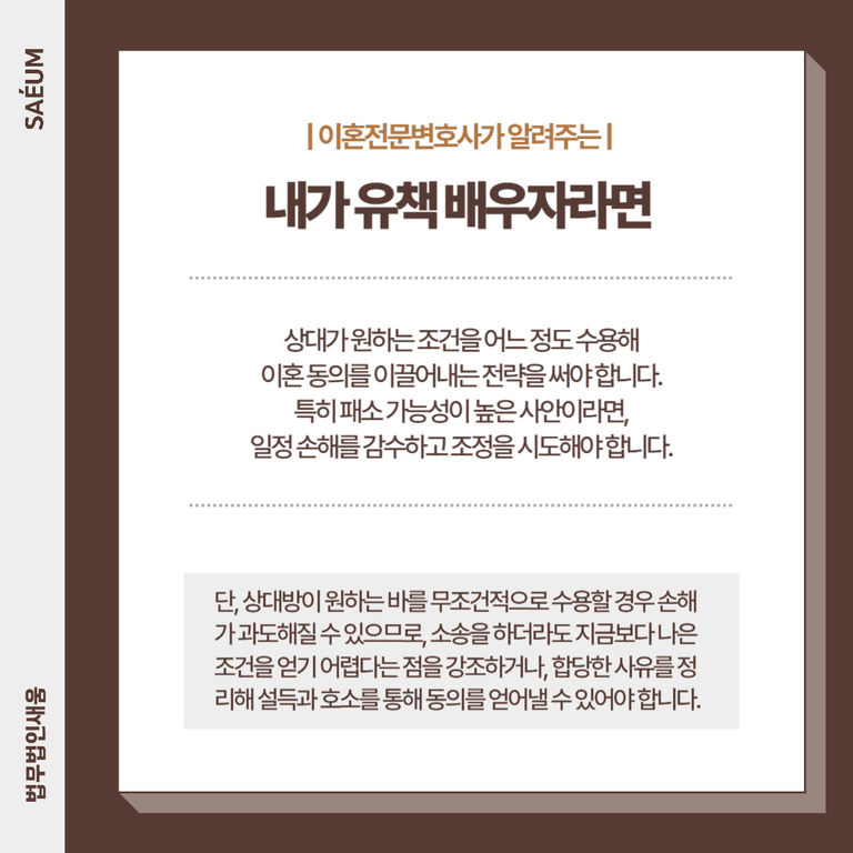 반대로 자신이 유책 사유를 제공한 입장이라면, 상대방이 원하는 조건을 어느 정도 수용해 동의를 이끌어내야 할 필요도 있습니다. 현실적으로 이혼 소송을 제기하더라도 패소할 가능성이 높은 사안이라면, 일정 부분 손해를 감수하고 조정을 시도해야 합니다. 단, 상대방이 원하는 바를 무조건적으로 수용할 경우 손해가 과도해질 수 있으므로, 소송을 하더라도 지금보다 나은 조건을 얻기 어렵다는 점을 강조하거나, 합당한 사유를 정리해 설득과 호소를 통해 동의를 얻어낼 수 있어야 합니다.