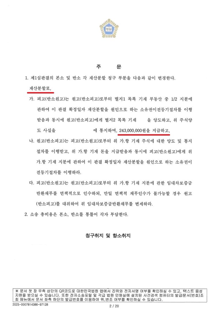 상대방은 의뢰인에게 재산분할로 2억 4천여 원을