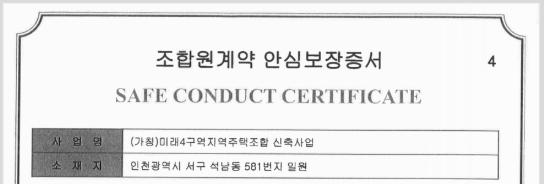 미래4지역주택조합 추진위원회는 인천 서구 석남동 581번지 일대를 사업구역으로 하여 지역주택조합 방식으로 아파트를 건설하고자 하는 단체입니다. 의뢰인들은 2022년 미래4지역주택조합 추진위원회와 조합 가입계약을 체결하셨습니다. 이때 미래4지역주택조합 추진위원회는 의뢰인들께 '안심보장증서'를 교부하였습니다.