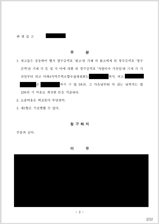 사실 이 사건은 미래4지역주택조합 추진위원회뿐만 아니라 업무대행사 역시 피고로 삼아 승소하였다는 점에서 매우 큰 의의가 있습니다. 의뢰인들께서는 위와 같이 승소한 이후 피고 미래4지역주택조합 추진위원회 명의로 된 부동산에 강제집행을 실시하여 경매절차를 진행하신 뒤 배당금을 수령하셨습니다.