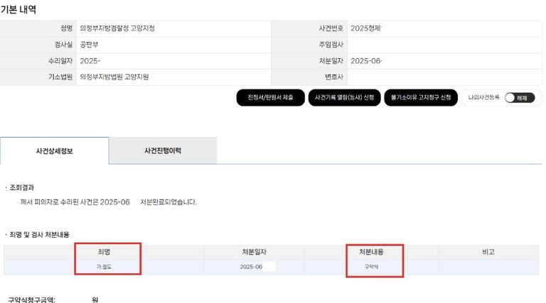 절도죄만 인정되어 벌금형 구약식 기소(벌금형 약식명령)로 사건 종결
