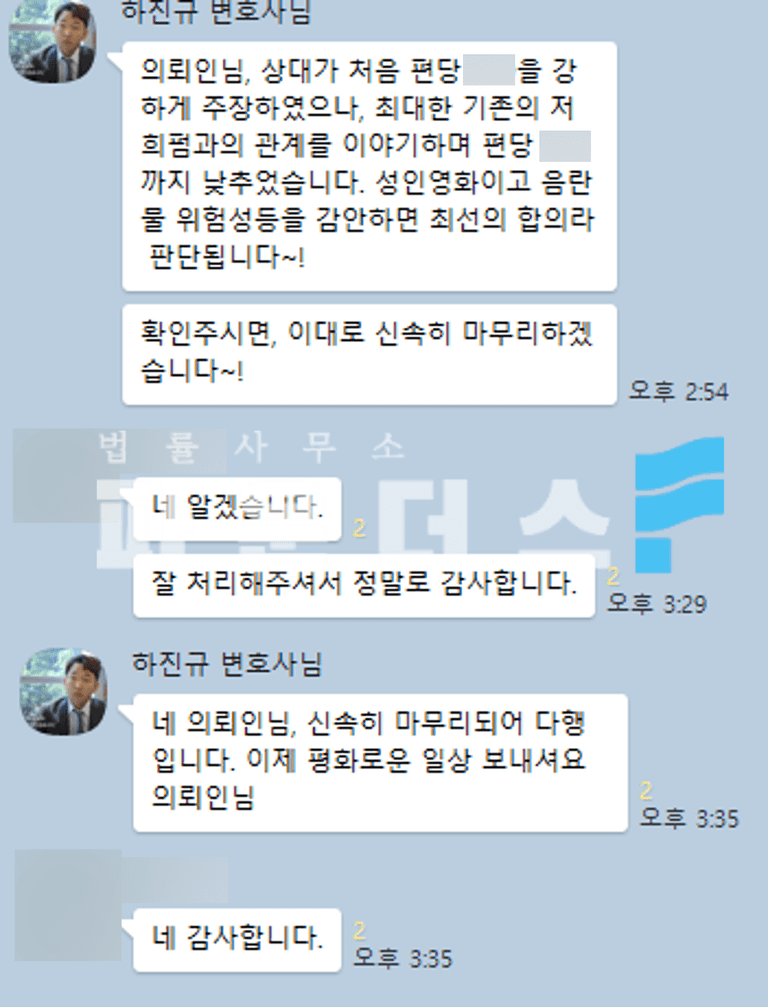 본 사건은 성인물 3편이 문제가 된 것으로 제작사에서 제시해 온 합의금액이 상당히 높아 의뢰인이 어려운 상황에 놓일 수 있었던 것으로 세심한 합의 대응이 중요했습니다.