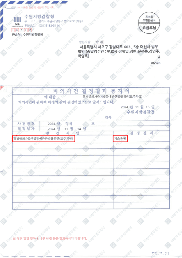 이는 형사처벌이 아닌 검찰 단계에서 사건을 종결시키는 조치로, 의뢰인은 전과기록 없이 일상으로 복귀할 수 있게 되었습니다.