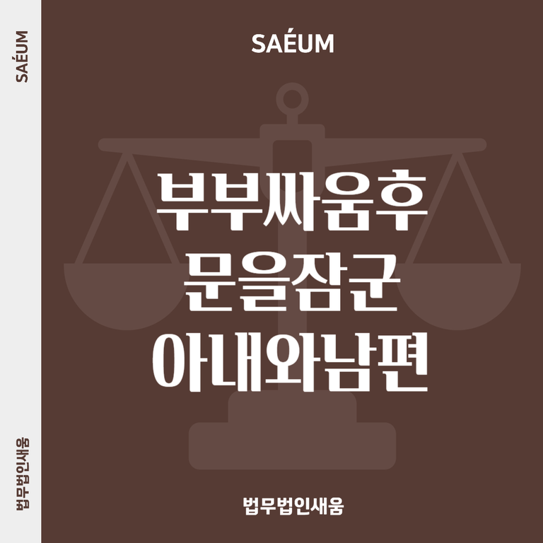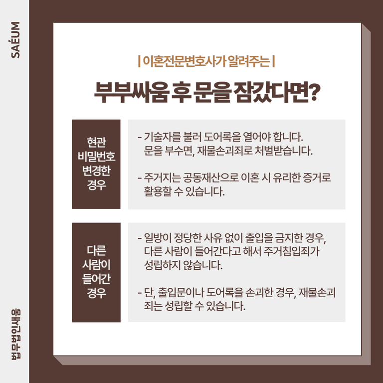 혼란스럽고, 분노가 치밀 수도 있습니다. 하지만 현실적으로 더 이상 배우자와 미래를 그릴 수 없을 만큼 부부싸움이 격화되었다면, 빠르게 이성을 되찾고, 자신에게 유리하게 혼인을 정리하는 방법을 고민하셔야 합니다. 특히 부부 사이가 악화되었을 때, 어떤 분들은 일방적으로 집에 들어오지 못하도록 비밀번호를 바꾸는 일도 벌어지는데요.