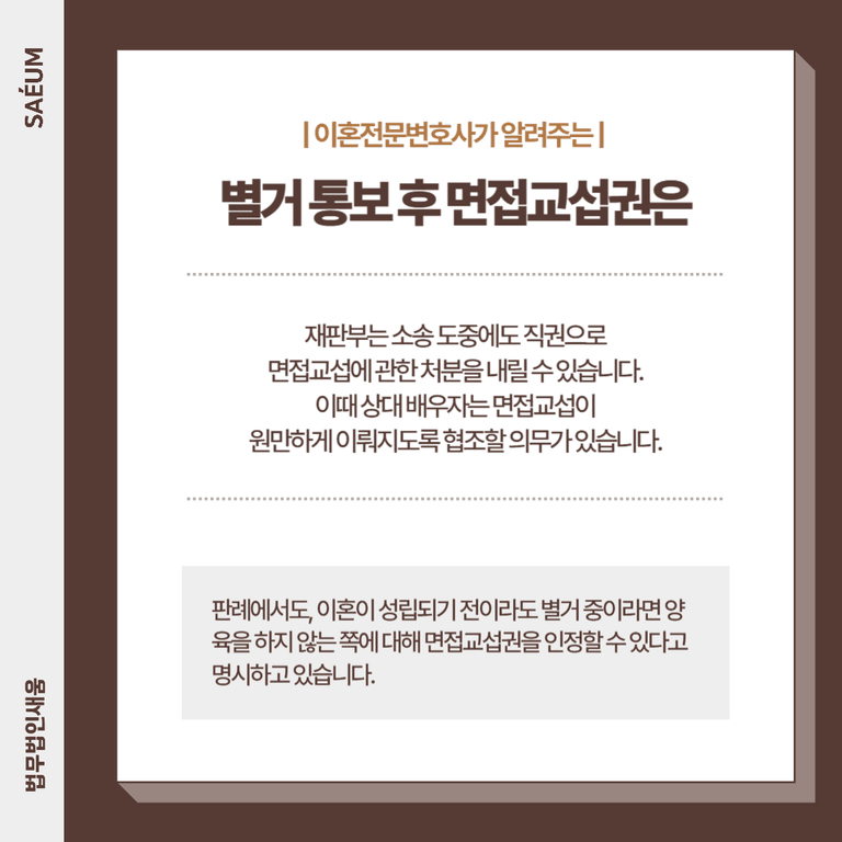 판례에서도, 이혼이 성립되기 전이라도 별거 중이라면 양육을 하지 않는 쪽에 대해 면접교섭권을 인정할 수 있다고 명시하고 있습니다. 따라서 상대의 독단적인 행동으로 별거하게 되었다면, 빠르게 변호사의 조력을 받아 면접교섭 사전처분을 신청하셔야 합니다.