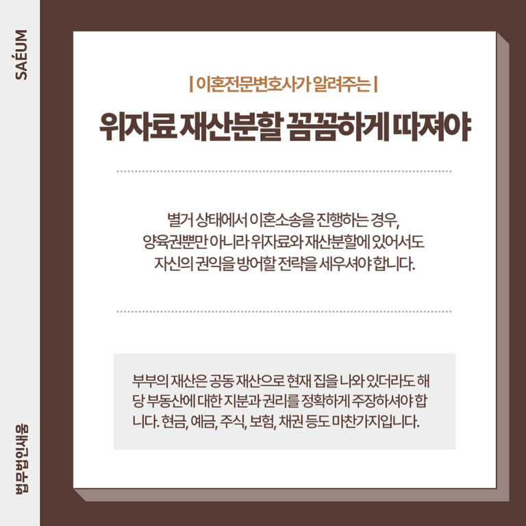 또한 부부의 재산은 원칙적으로 공동 재산으로 보므로, 현재 집을 나와 있더라도 해당 부동산에 대한 지분과 권리를 정확하게 주장하셔야 합니다. 현금, 예금, 주식, 보험, 채권 등도 마찬가지입니다. 자신이 재산 형성에 기여한 사실을 입증하여, 불리한 분할 결과가 나오지 않도록 사전에 대비하셔야 합니다.