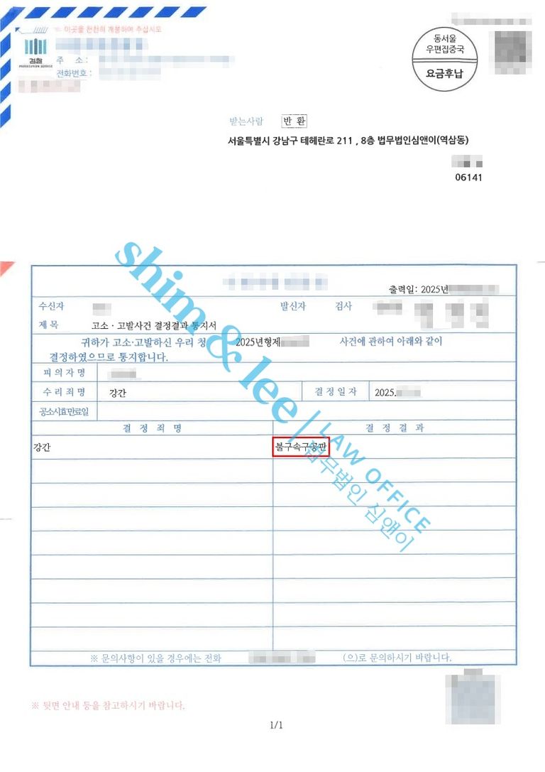 -담당 검사님은 피해자의 일관된 진술과 심앤이 변호사팀이 제출한 의견서를 종합적으로 판단한 끝에, 가해자의 강간 혐의에 대하여 구공판 기소 처분을 결정하였습니다.
