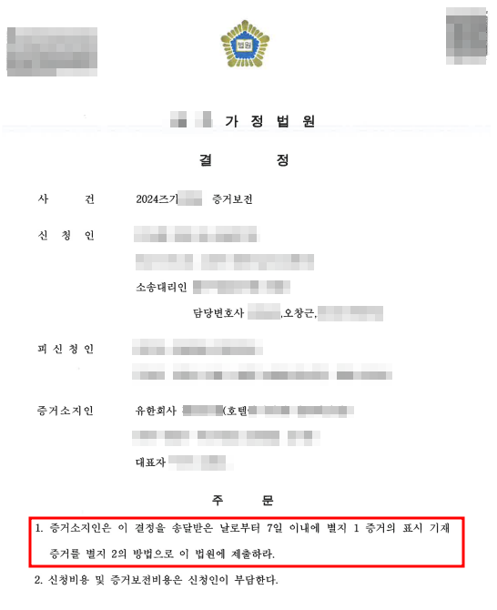 법원이 제출된 신청서에 기재된 사항을 검토 후 증거물 소지인에게 제출명령을 내립니다. 이후 증거제출명령을 받은 영상소지인은 CCTV를 보전하여 법원에 제출하여야 합니다.