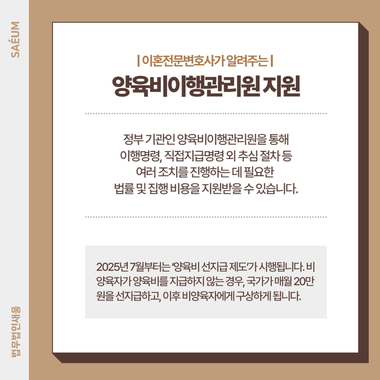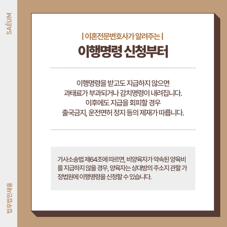 법무법인 새움은 양육비 집행부터 감치명령, 자산 압류, 추심, 그리고 양육비이행관리원 연계까지 끝까지 책임지는 조력자가 되겠습니다.