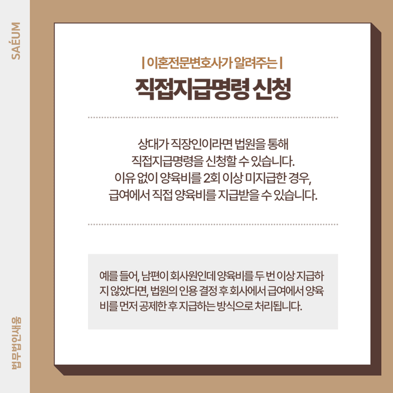 전 배우자가 직장을 다니고 있는 경우라면, 법원을 통해 직접지급명령을 신청할 수도 있습니다. 가사소송법 제63조는 비양육자가 정당한 사유 없이 양육비를 2회 이상 미지급한 경우, 직장(또는 소득 지급처)을 통해 양육자가 직접 양육비를 지급받을 수 있도록 허용합니다.