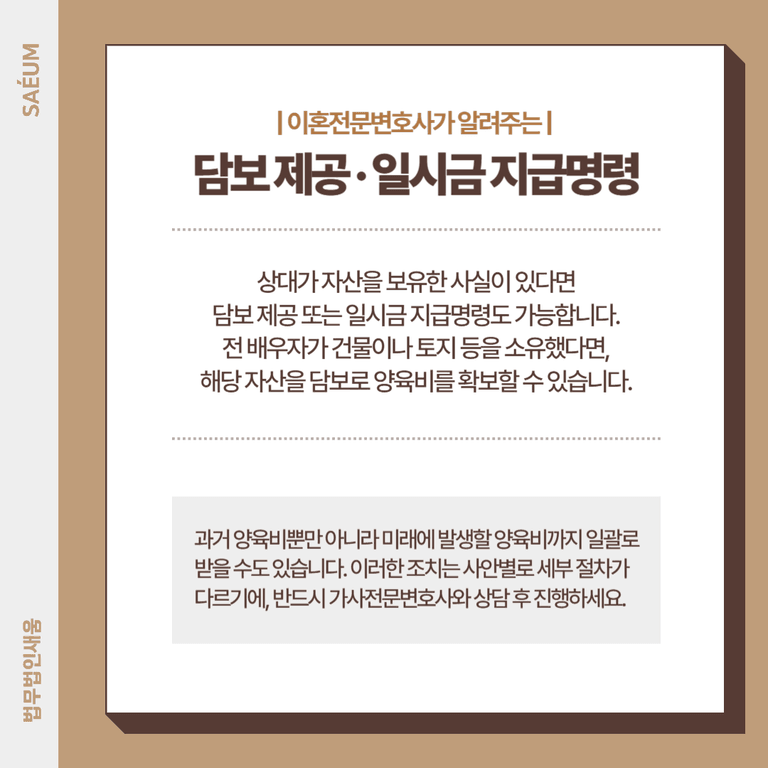 전 배우자가 건물이나 토지 등의 부동산을 소유하고 있다면, 해당 자산을 담보로 설정하여 양육비를 확보하는 방식입니다. 심지어 과거 양육비뿐만 아니라 미래에 발생할 양육비까지 일괄로 받을 수도 있습니다.