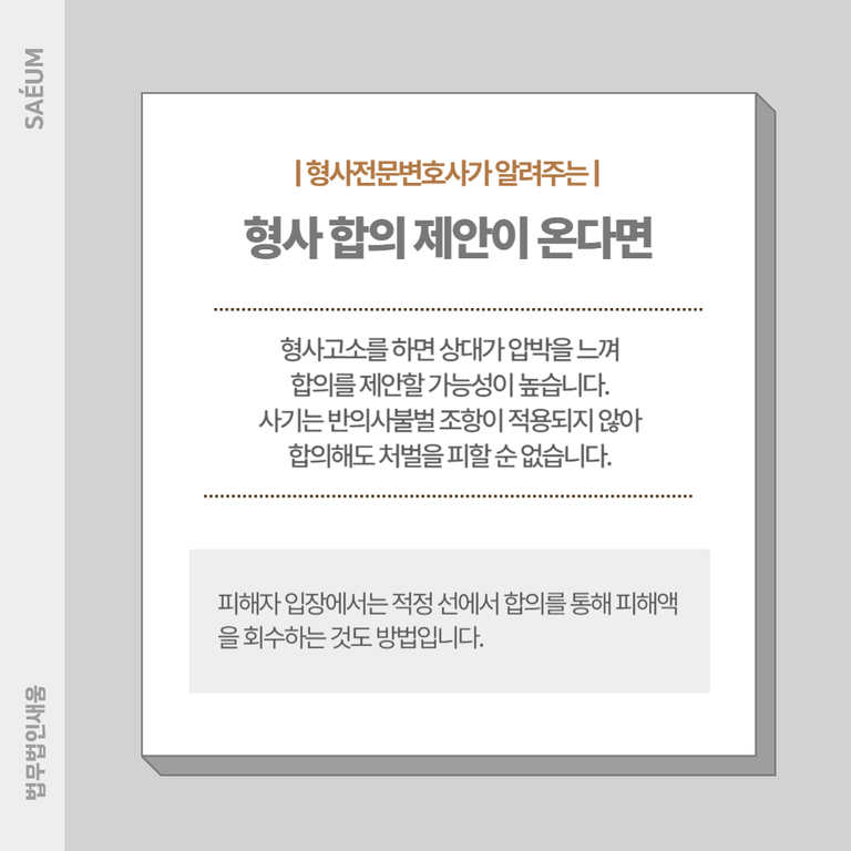 가벼운 범죄가 아니기에, 명확한 증거 확보 후 고소하면 상대가 압박을 느껴 합의를 제안할 가능성이 높습니다. 이 죄목은 반의사불벌 조항이 적용되지 않아 합의해도 처벌을 피할 수 없습니다.