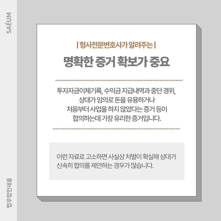 투자 자금 이체 기록, 수익금 지급 내역과 중단 경위, 상대가 임의로 돈을 유용하거나 처음부터 사업을 하지 않았다는 증거 등이 가장 중요합니다. 이런 자료로 고소하면 사실상 처벌이 확실해 상대가 신속히 합의를 제안하는 경우가 많습니다.