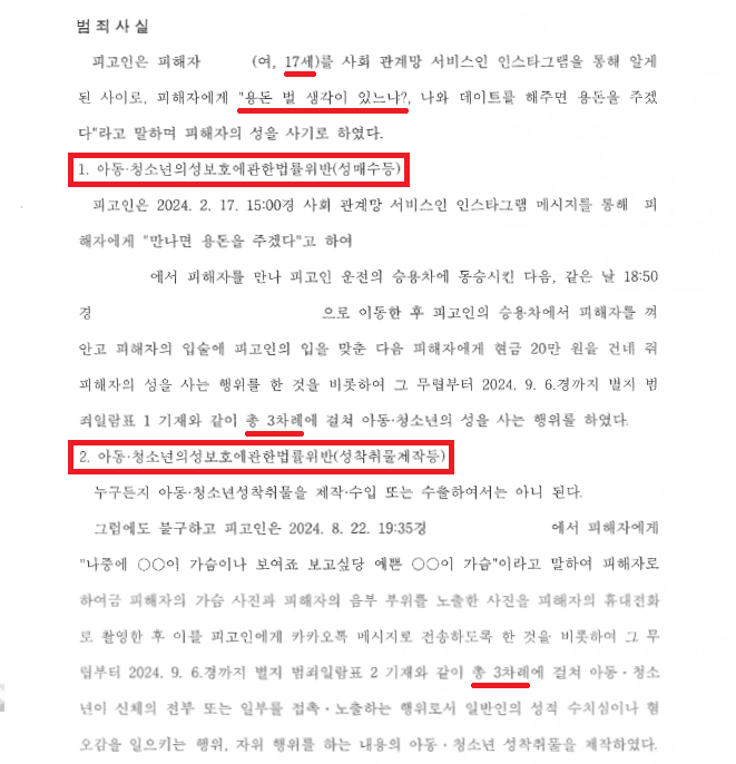 (1) 조건만남을 하면 용돈을 벌게 해주겠다고 제안하여 2024. 2. 17.경부터 2024. 9. 6.경까지 총 3차례에 걸쳐 조건만남을 하고,