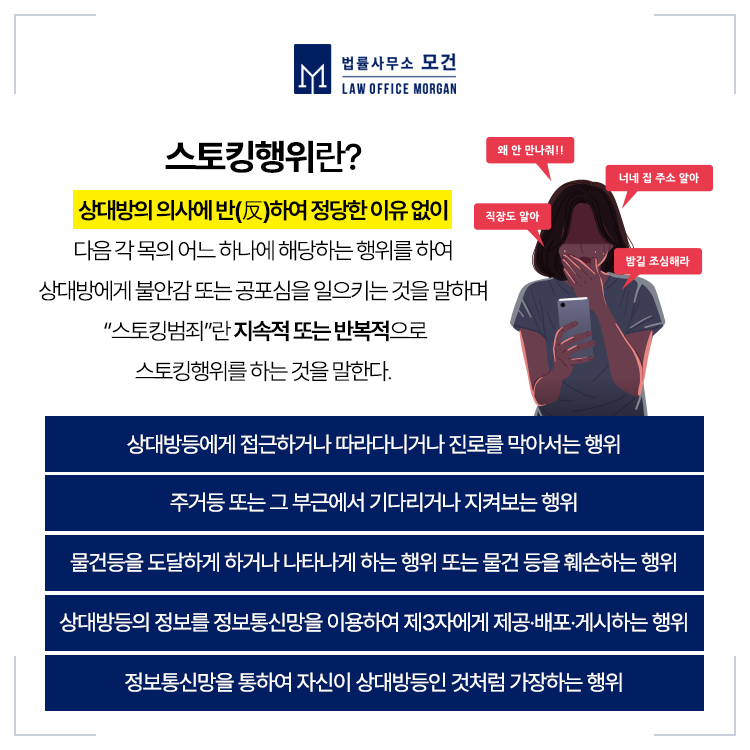 예전에는 스토킹이라는 행위가 단순 '경범죄'로 처벌은 솜방망이 수준이었습니다. 그러나 이로인한 크고 작은 범죄들이 끊임없이 발생하면서 2021. 10. 21. 스토킹처벌법이 본격적으로 시행되었습니다.