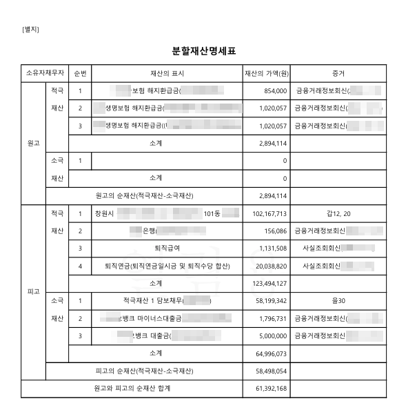 이 재산을 기초로 양 당사자측 변호사는 아래와 같이 재산분할명세표를 작성합니다.