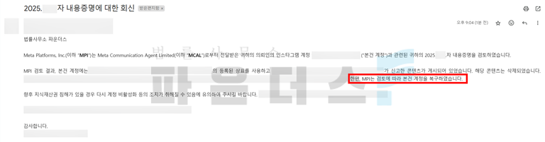 이 같은 상황에서 홀로 메타 측에 메일을 보내거나 고객센터에 문의를 해도 어떠한 회신을 받지 못하는 분들이 많은데 여기서 변호인의 조력을 요청하게 될 경우 평소 의뢰인이 운영해오던 계정 내용과 문제가 된 게시물에 있어 문제가 될 만한 행위를 하지 않았음에 대한 내용증명 작성 및 발송에 도움을 드리게 됩니다.