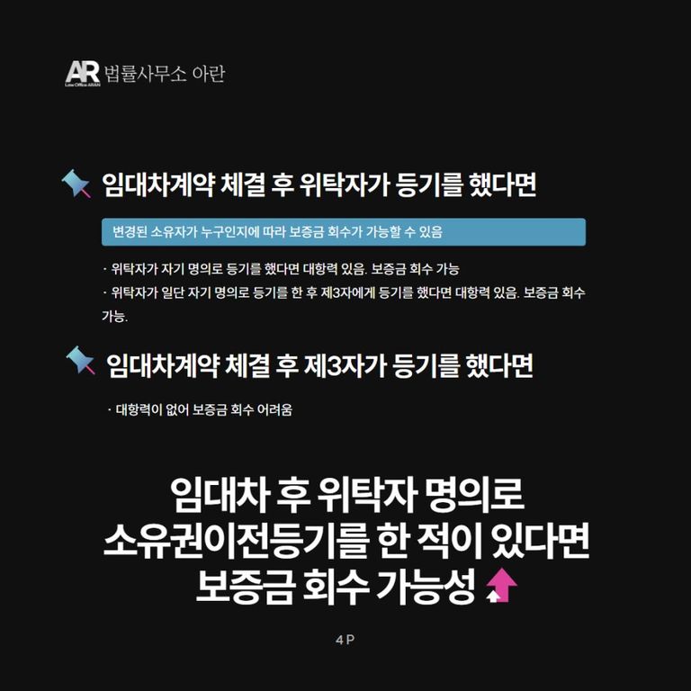 만약 변경된 소유자가 종전 집주인(위탁자)이라면 그 순간 세입자는 대항력을 취득하므로 이때부터는 세입자의 보증금 회수가 가능합니다.