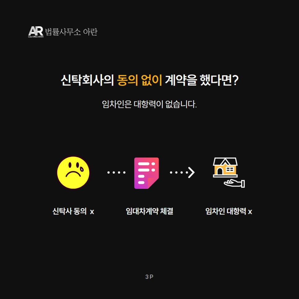 이때 신탁계약서에는 '신탁계약 체결 후 신탁회사가 동의 없이 임대차계약을 체결할 경우, 신탁 회사에게는 효력이 없다'라는 취지의 규정이 있는 경우가 대부분입니다.