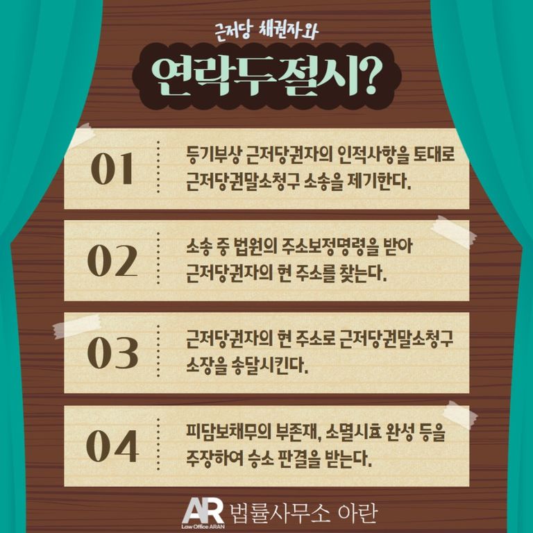 실제로 법률사무소 아란에서는 연락이 두절되거나, 해산간주된 법인 등을 상대로 근저당권말소청구의 소송을 제기하여 근저당권자의 인적사항을 특정한 다음 근저당권을 말소시키는 판결을 이끌어내고 있습니다.