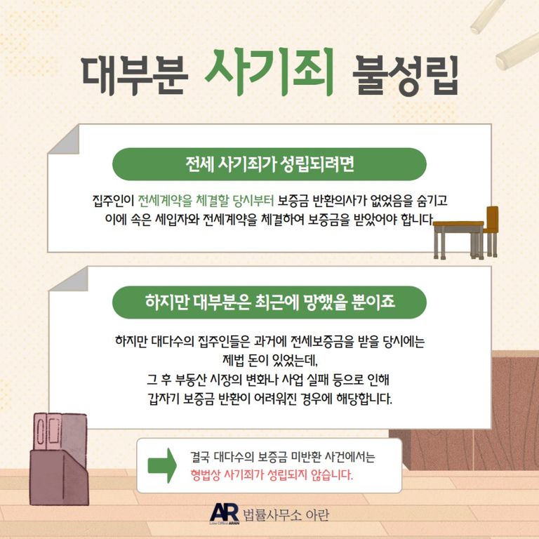 그렇다 보니 실제로 전세보증금을 받지 못한 사례 중 형법상 사기죄가 성립되는 사례는 지극히 드뭅니다.