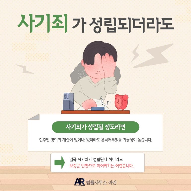 드물게 형법상 사기죄가 성립된다 하더라도, 보증금을 받아내기란 매우 어렵습니다.