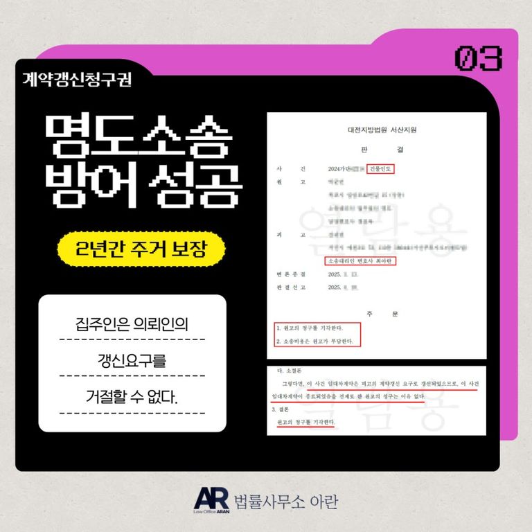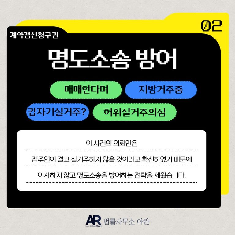 오늘 소개드린 사건의 의뢰인은 반드시 계속 거주해야만 하는 개인적인 사정이 있었고, 집주인의 실거주가 허위라고 확신할 정도의 사정이 있었기 때문에 버티는 것을 선택하셨는데요. 의뢰인의 선택에 승소라는 좋은 결과로 보답할 수 있어 저역시 보람찼던 사건으로 기억됩니다.