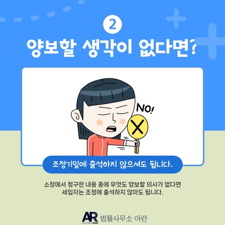 소장에서 청구한 내용 중 단 한가지도 양보할 의사가 없다면, 세입자는 조정기일에 출석하지 않아도 됩니다.
