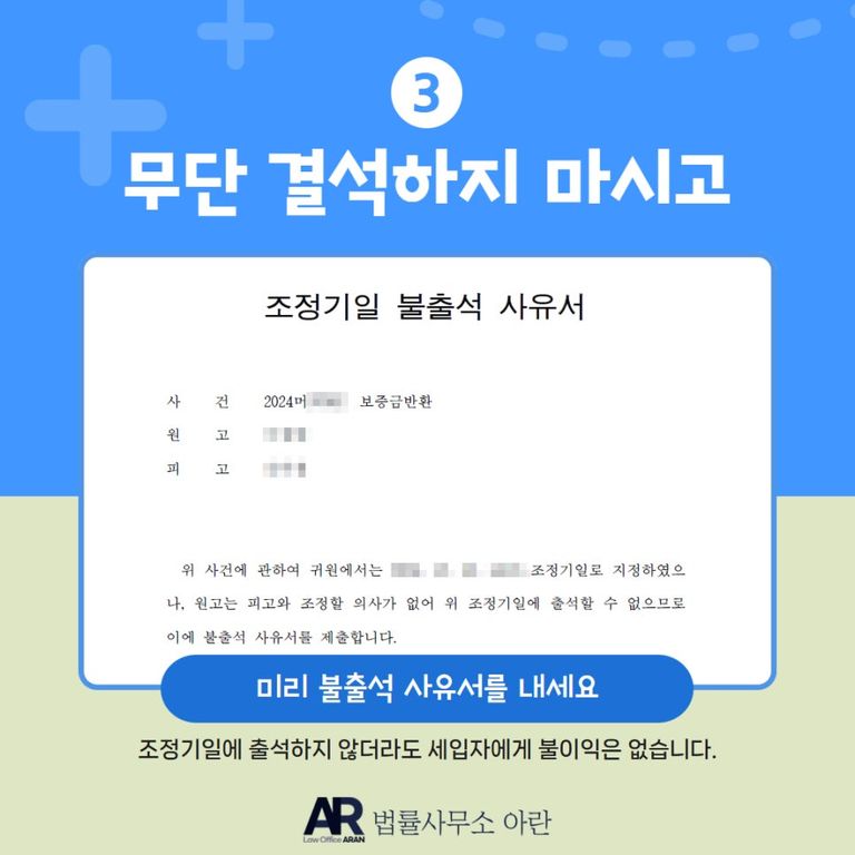 그러므로 세입자가 조정기일에 출석하지 않을 생각이라면, 법원에 '불출석 사유서'를 제출하는 것이 좋습니다.