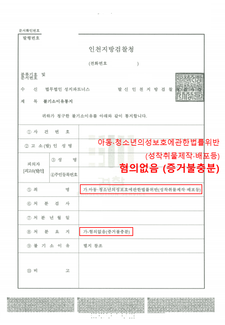 검찰은 증거 불충분하여 혐의가 없다고 판단하여 혐의없음(증거불충분) 불기소 처분을 내렸습니다.
