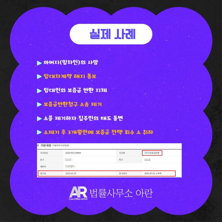 결과적으로 의뢰인은 소 제기 후 3개월 만에 집주인으로부터 보증금 전액을 깔끔하게 회수하고 소를 취하하였습니다.