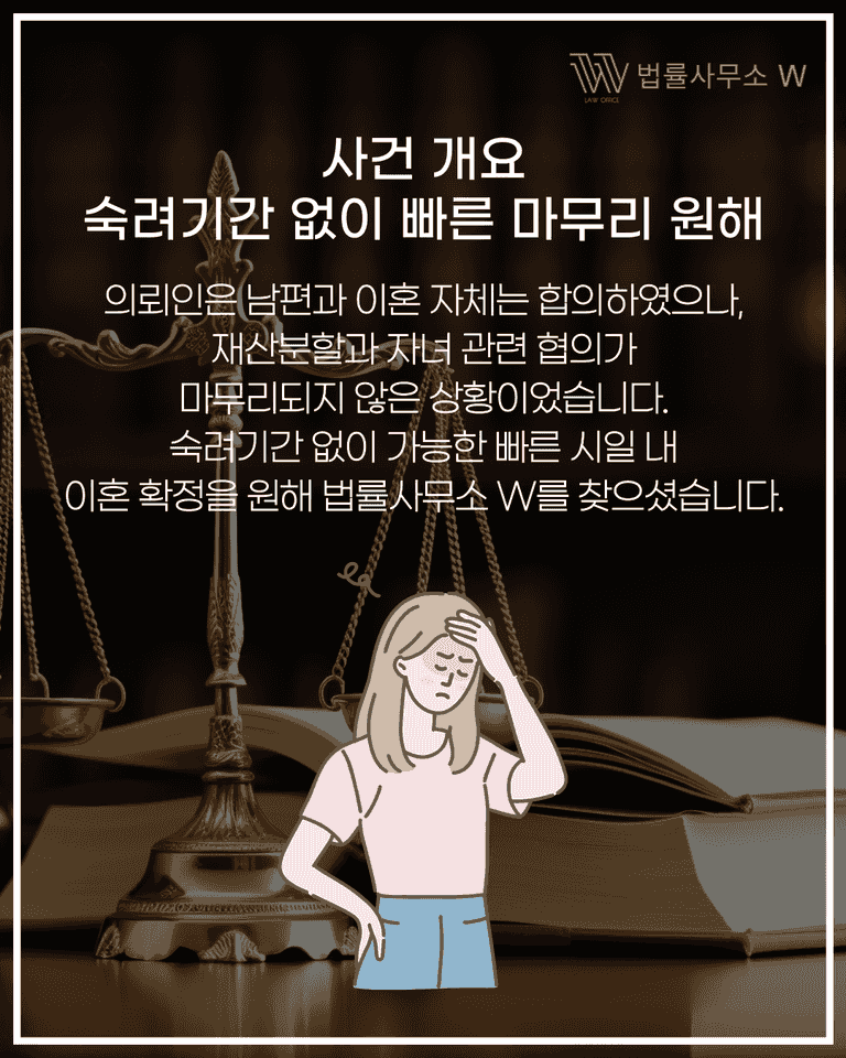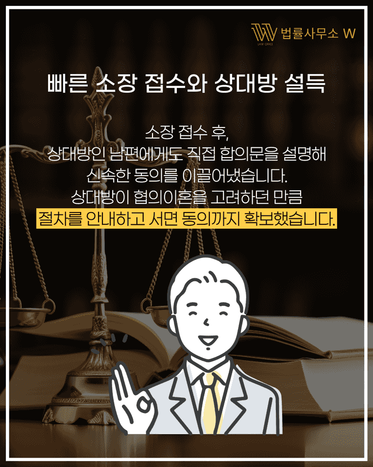 법률사무소 W에서는 사건의 복잡성과 의뢰인의 상황을 종합적으로 고려해, 불필요한 시간 낭비 없이 최적의 전략으로 이혼 절차를 설계해드립니다.