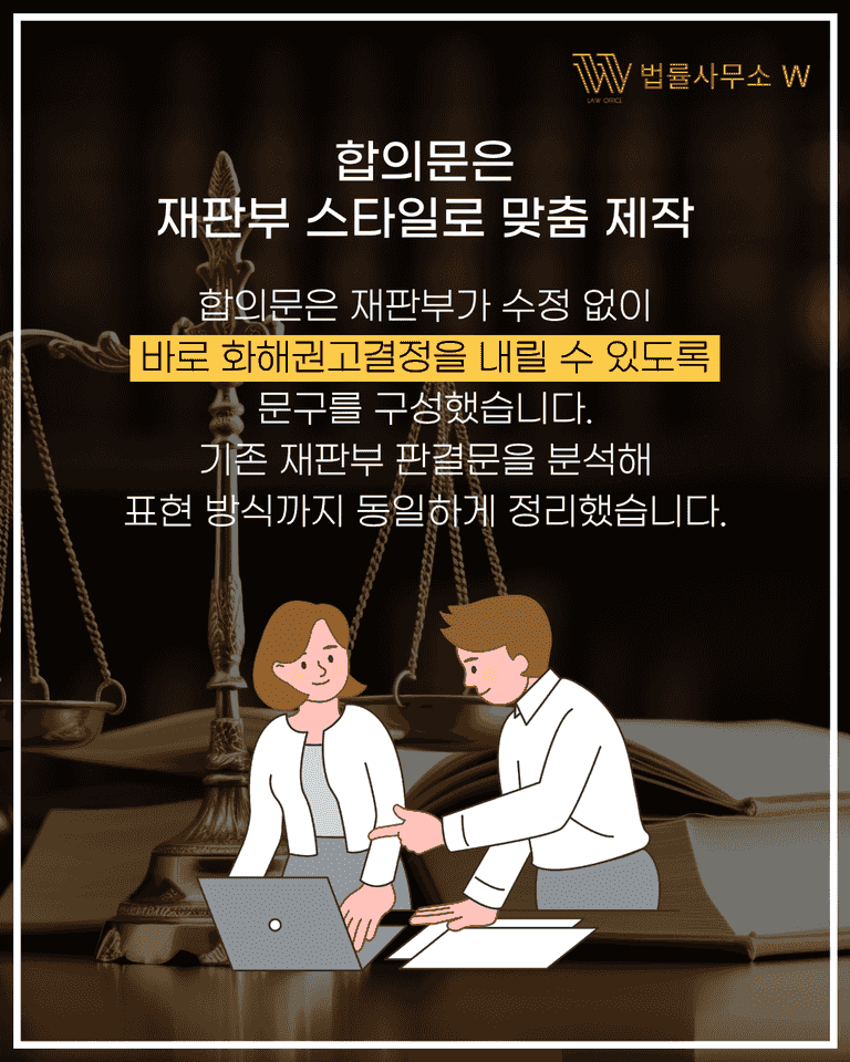 남편도 이혼에 동의하고 있었기에, 제가 직접 연락을 드려 합의문의 내용을 상세히 설명하고 설득했습니다. 이 과정이 잘 이루어져야 화해권고결정이 원활하게 내려집니다.재판부 스타일에 맞춘 합의문 정리
