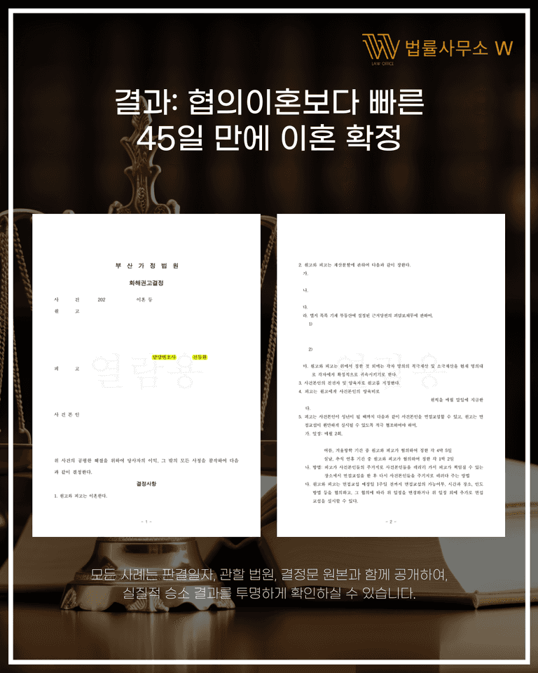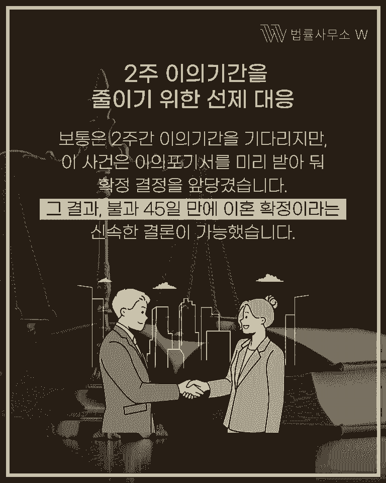 재판부에서 화해권고결정을 내리면 원칙적으로 2주간의 이의신청 기간이 있습니다. 저는 의뢰인과 남편의 이의포기서를 사전에 받아 법원에 제출했고, 그 결과 결정이 즉시 확정되어 45일 만에 사건이 종료될 수 있었습니다.