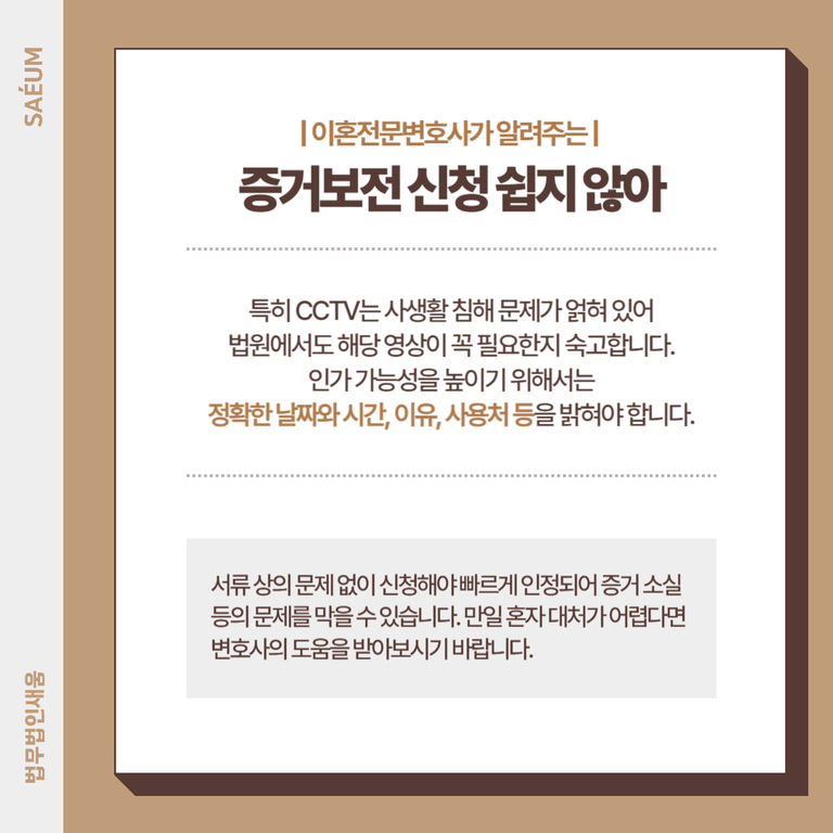 개인 소유의 CCTV는 영상 제출 시 사생활 침해 등의 문제가 있을 수 있습니다. 그렇기에 법원에서도 해당 영상이 꼭 필요한지 충분히 고려하고 검토하여 결정을 하게 되는데요. 인가 가능성을 높이기 위해서는 확보하고자 하는 날짜와 시간을 명확히 정해두는 것이 좋으며, 왜 영상을 확보해야 하는지에 대한 이유와 사용처 등을 밝혀야 합니다. 서류 상의 문제 없이 신청해야 빠르게 인정되어 증거 소실 등의 문제를 막을 수 있습니다.