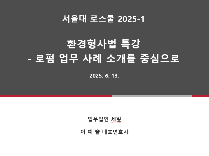 이예슬 변호사는 2025년 6월 13일(금), 서울대학교 로스쿨 환경법 수강생들을 대상으로 「환경형사법 특강 – 로펌 업무 사례 소개를 중심으로」라는 주제로 특강을 진행하였습니다.