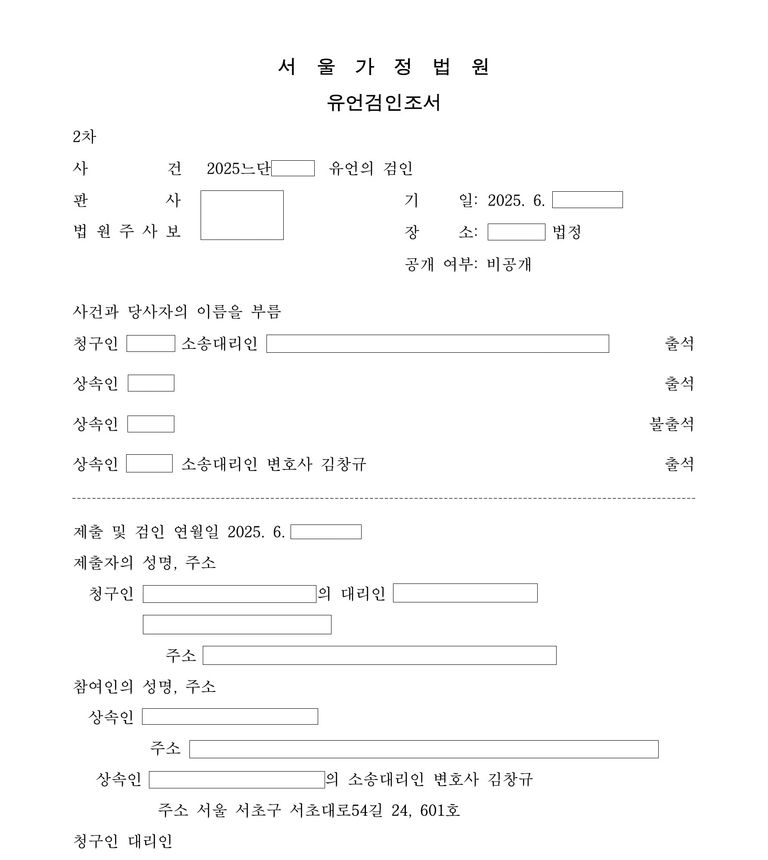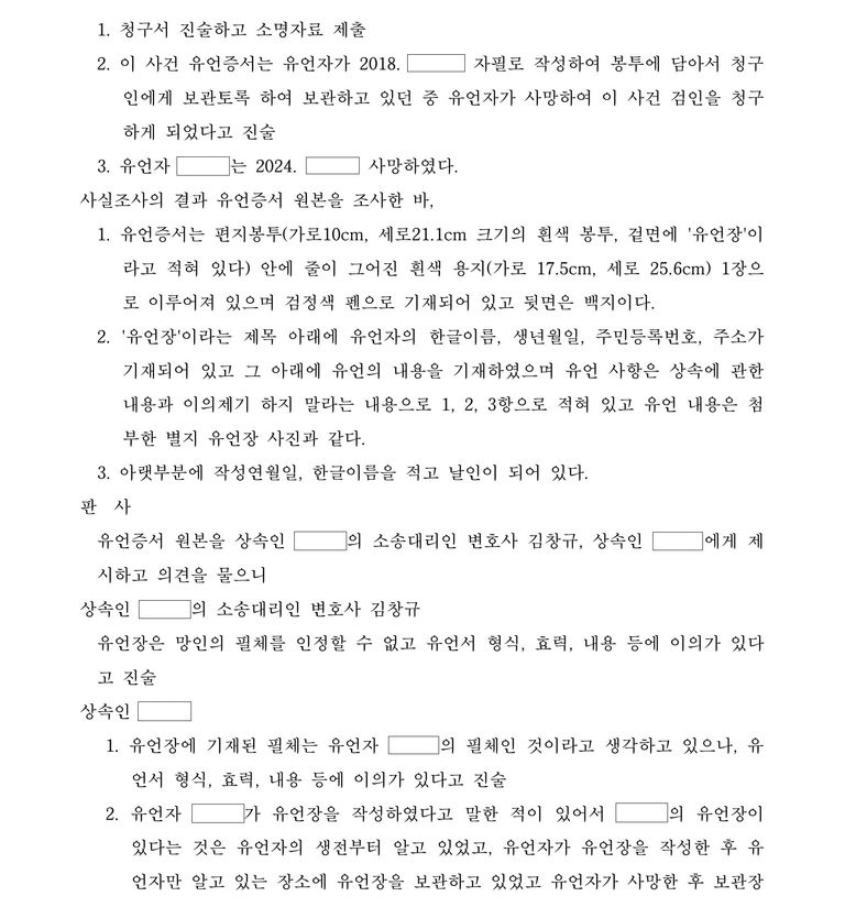 자필증서에 의한 유언장에 대하여 유언검인을 하였는데, 상속인 중 1인을 대리하였습니다. 유언자의 필체를 인정할 수 없다고 이의하였습니다.