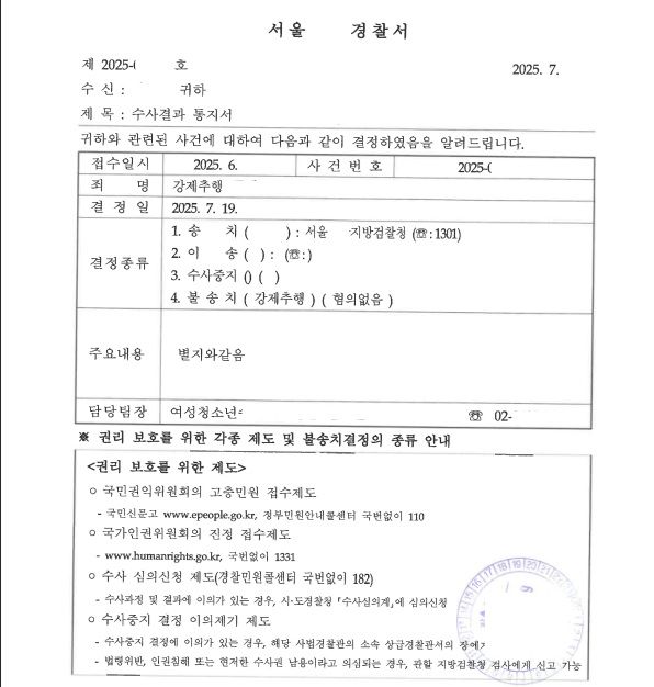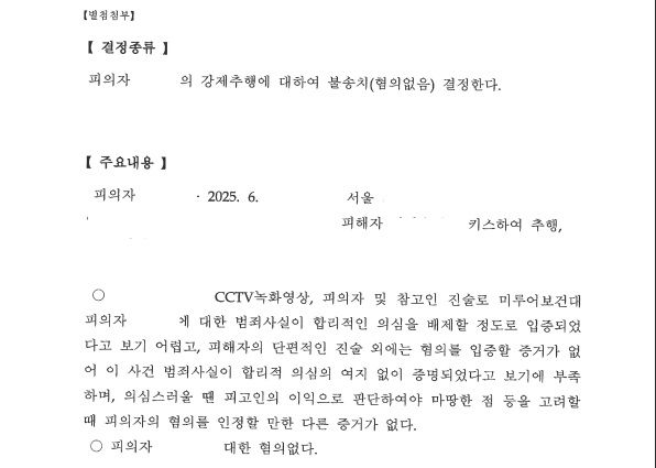 경찰은 변호인의 의견을 적극 수용하여 강제추행죄에 대해 무혐의 불송치 처분을 내렸습니다.