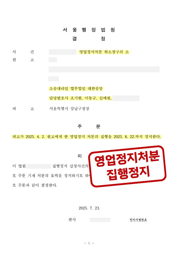 이동규 변호사는 A씨의 전후사정을 살펴본 뒤, 영업정지 처분을 취소받기 위해 행정소송을 제기하였습니다. 그리고 재판이 진행되는 동안 영업정지처분의 집행으로 인해 의뢰인이 받을 회복하기 어려운 금전적 손해와 집행정지가 공공복리에 중대한 영향을 미칠 우려가 없을 것등에 대한 자료로 제출하고 이를 토대로 재판부에게 집행정지처분을 적극적으로 주장하였습니다.