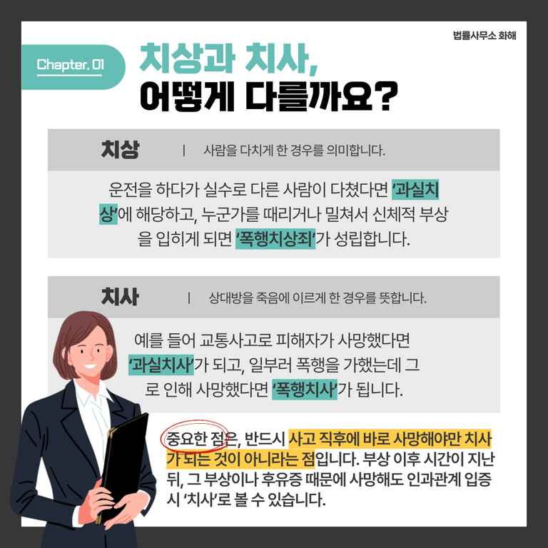 실제로 같은 사고라 하더라도 상대방이 다쳤을 때와 목숨을 잃었을 때, 가해자에 대한 형사처벌 수위와 피해자가 받을 수 있는 손해배상의 액수가 확연히 달라집니다. 그래서 오늘은 이런 ‘한 글자 차이’가 어떤 법적 결과로 이어지는지 쉽게 풀어서 설명드리겠습니다.