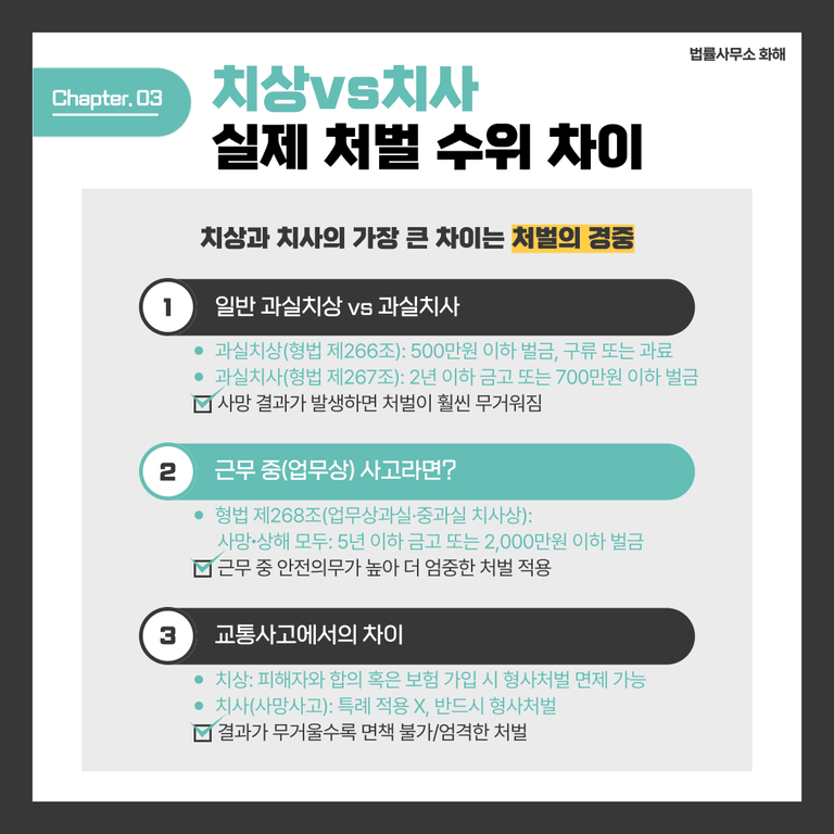 또한 교통사고에서도 치상과 치사의 차이는 더욱 두드러지는데요. 교통사고처리특례법에 따르면 단순 교통사고의 치상은 피해자와 합의하거나 종합보험에 가입한 경우 형사처벌이 면제될 수 있지만, 치사(사망사고)는 이 같은 특례가 적용되지 않아 반드시 형사처벌을 받게 됩니다. 이처럼 결과의 경중과 법의 보호 가치에 따라 치상과 치사의 처벌 수위는 분명하게 구분되고, 침해된 법익이 크면 클수록 처벌 역시 무거워지는 구조임을 알 수 있습니다.